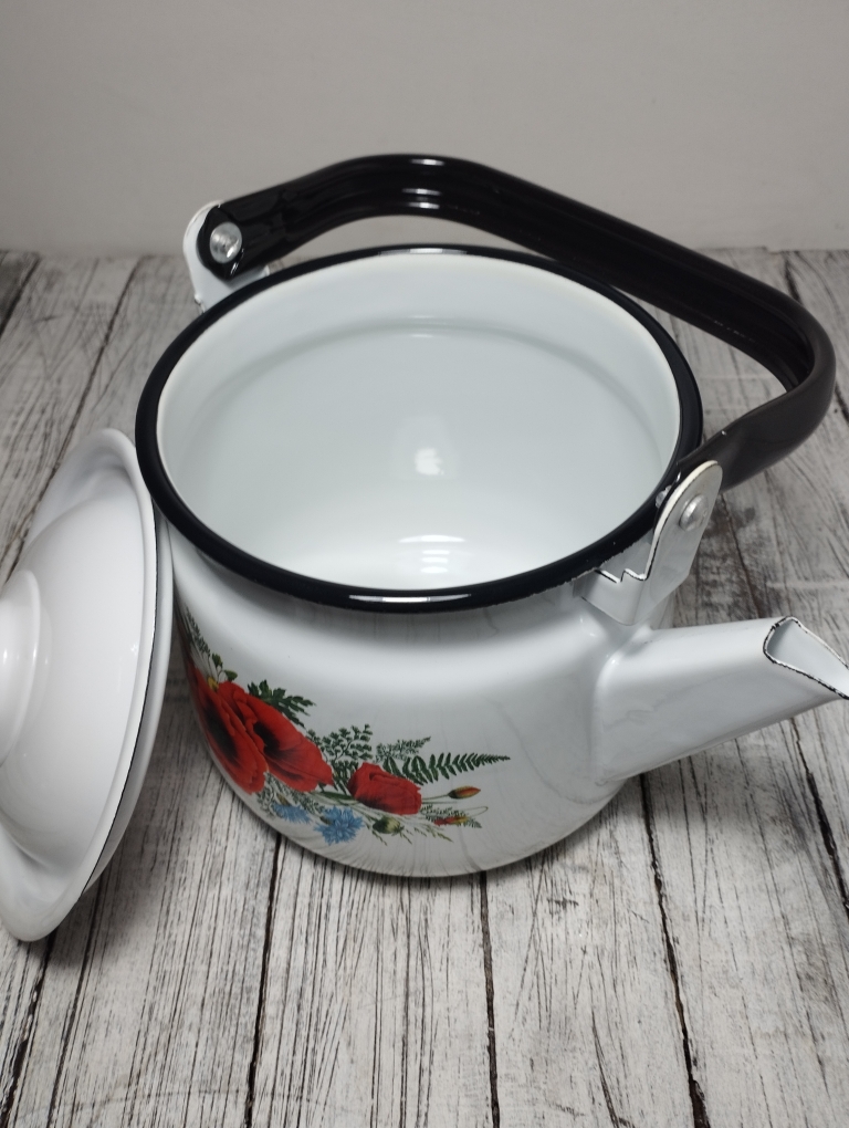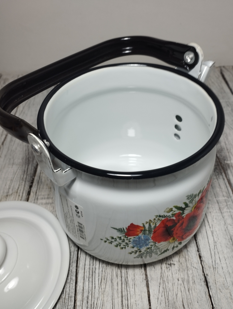 Чайник оснащен подвижной ручкой, что делает его лёгким в эксплуатации и значительно упрощает наливание кипятка. Эта модель совместима со всеми видами плит, включая индукционные, что делает его универсальным выбором для любой кухни. Основной материал — эмалированная сталь, которая обеспечивает долговечность и устойчивость к коррозии.