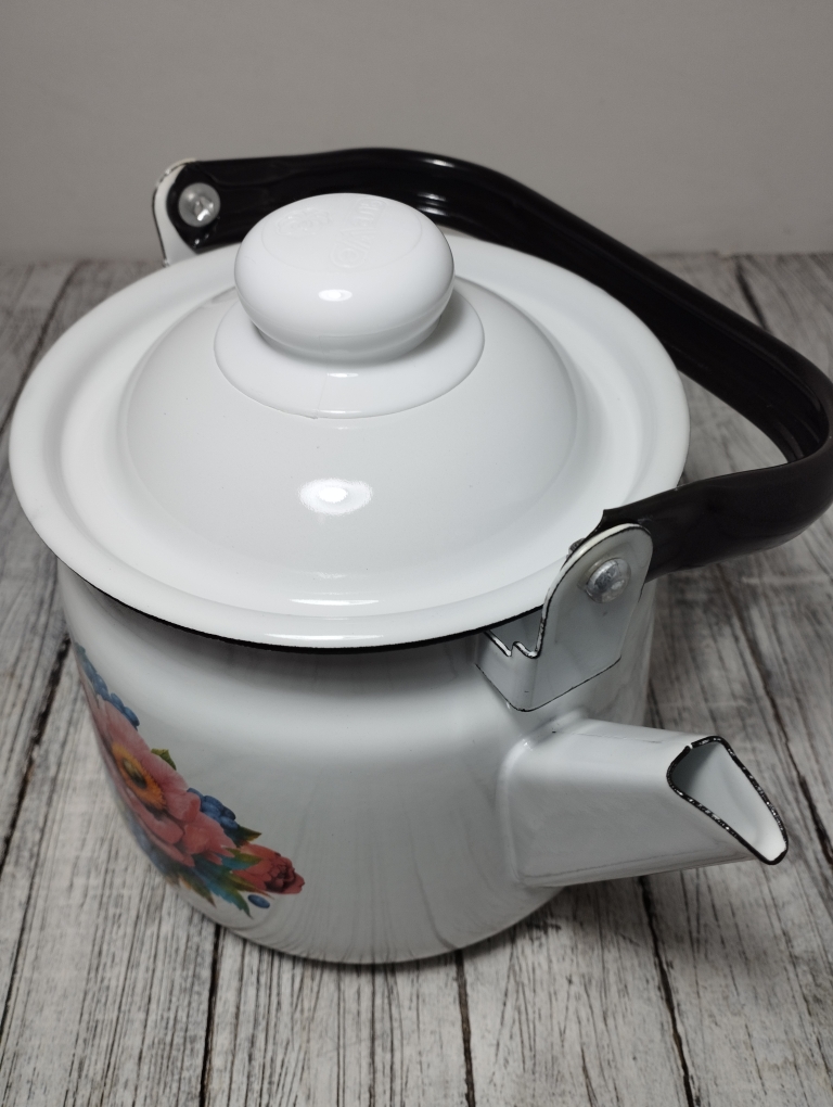 Чайник оснащен подвижной ручкой, что делает его лёгким в эксплуатации и значительно упрощает наливание кипятка. Эта модель совместима со всеми видами плит, включая индукционные, что делает его универсальным выбором для любой кухни. Основной материал — эмалированная сталь, которая обеспечивает долговечность и устойчивость к коррозии.