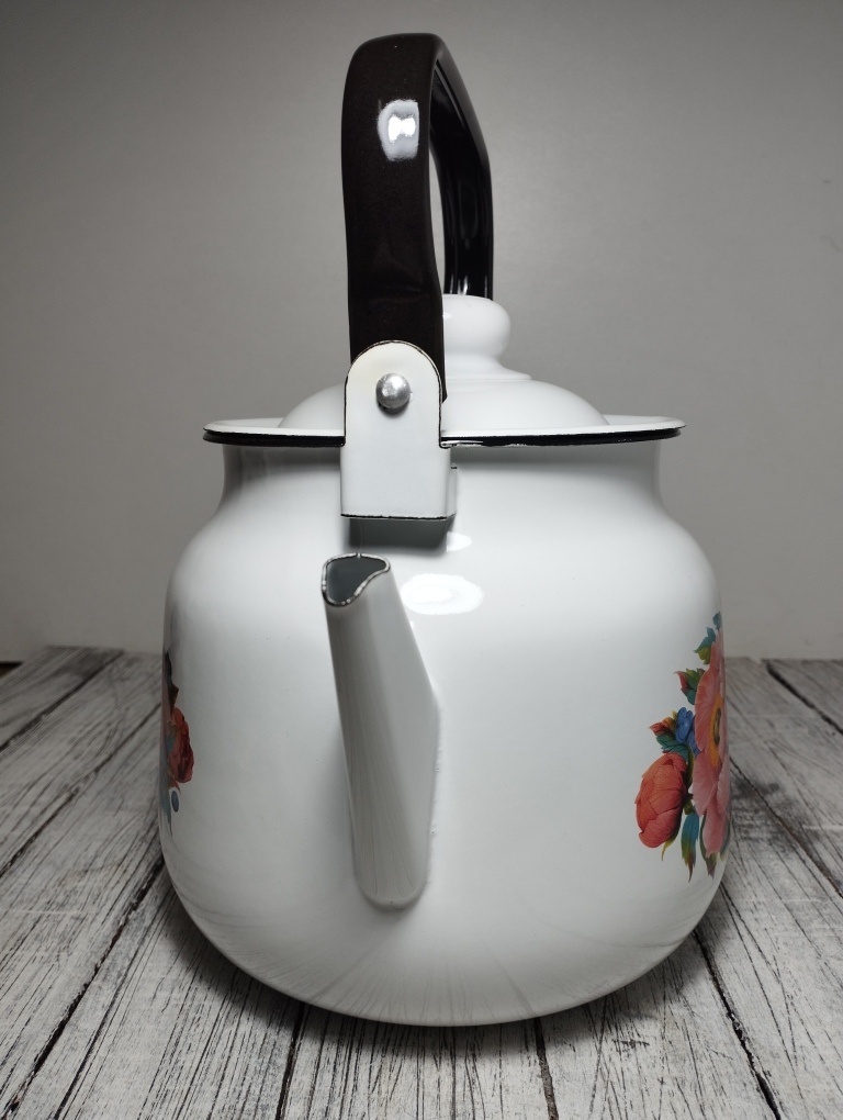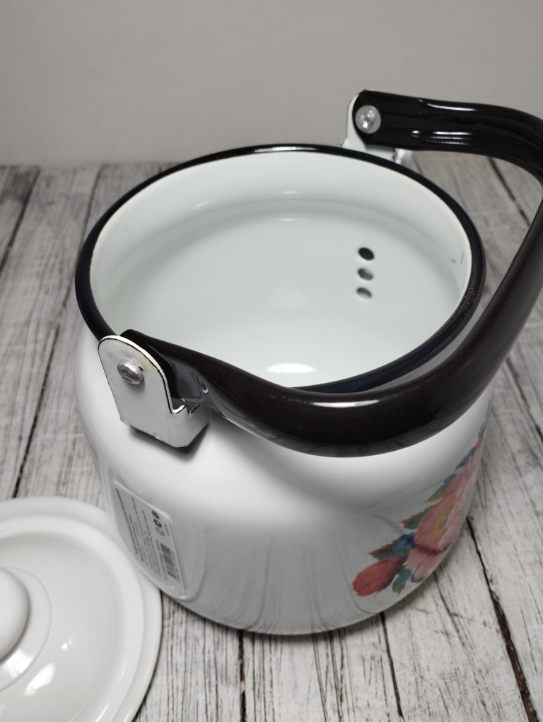 Чайник оснащен подвижной ручкой, что делает его лёгким в эксплуатации и значительно упрощает наливание кипятка. Эта модель совместима со всеми видами плит, включая индукционные, что делает его универсальным выбором для любой кухни. Основной материал — эмалированная сталь, которая обеспечивает долговечность и устойчивость к коррозии.