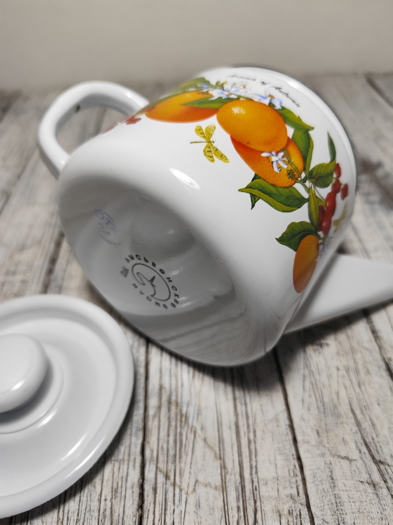 Изготовлен из высококачественной эмали, что обеспечивает его долговечность и легкость в уходе. Этот чайник можно использовать на всех типах плит, включая индукционные, что делает его универсальным и функциональным.