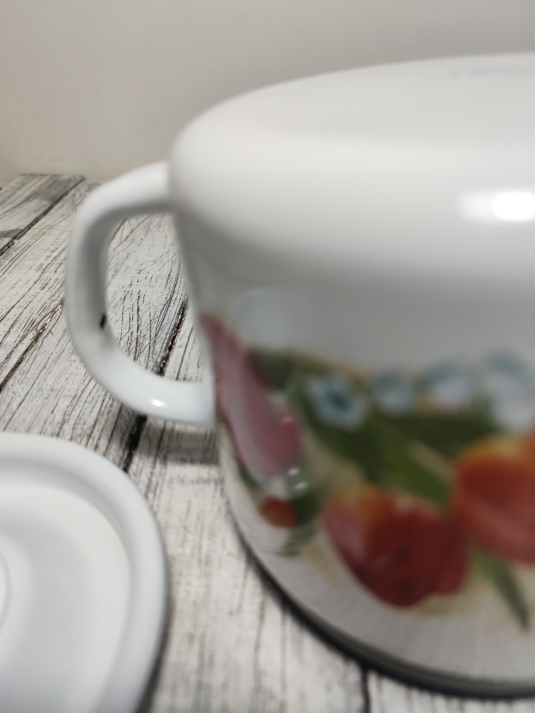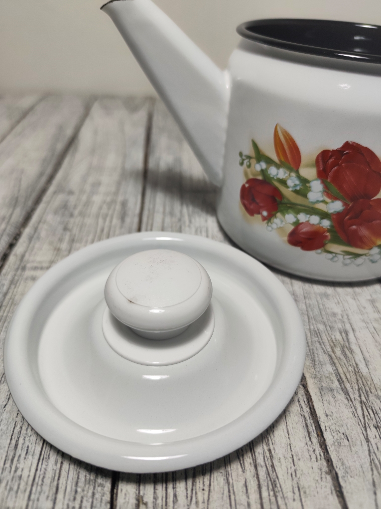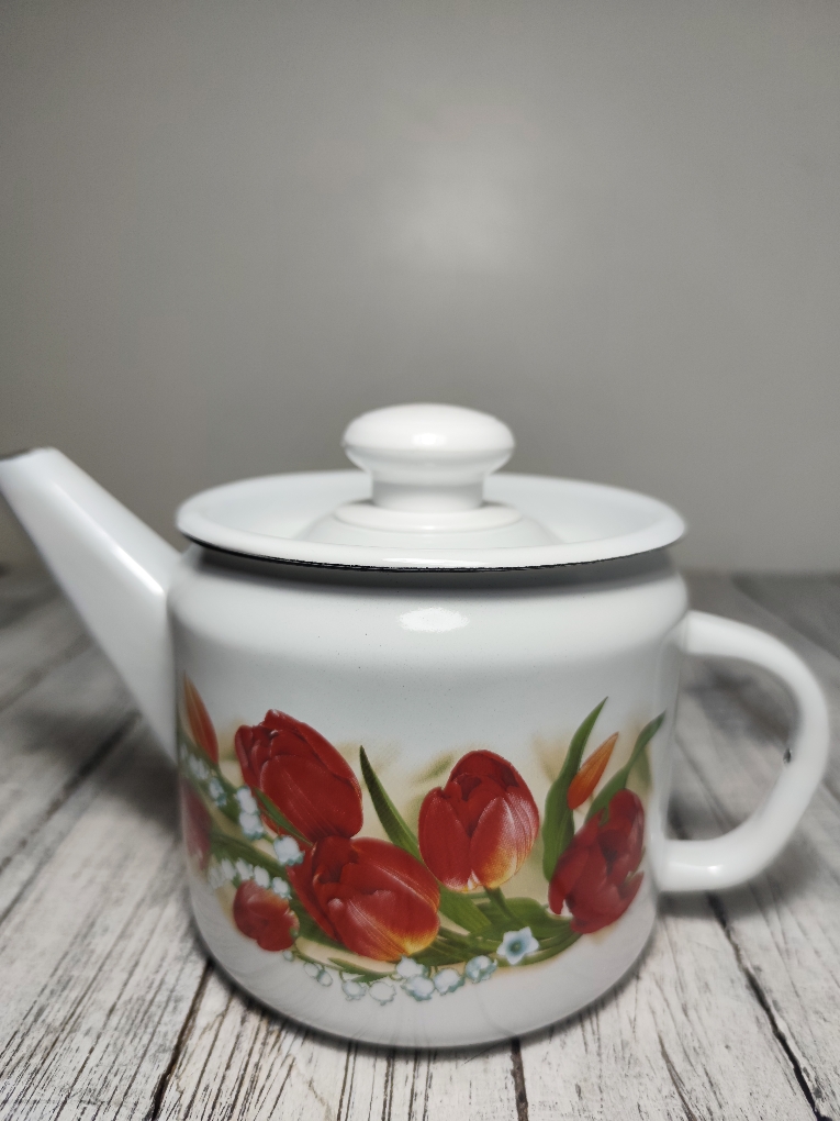 Чайник изготовлен из высококачественной эмали, что обеспечивает его долговечность и легкость в уходе. Этот чайник можно использовать на всех типах плит, включая индукционные, что делает его универсальным и функциональным.