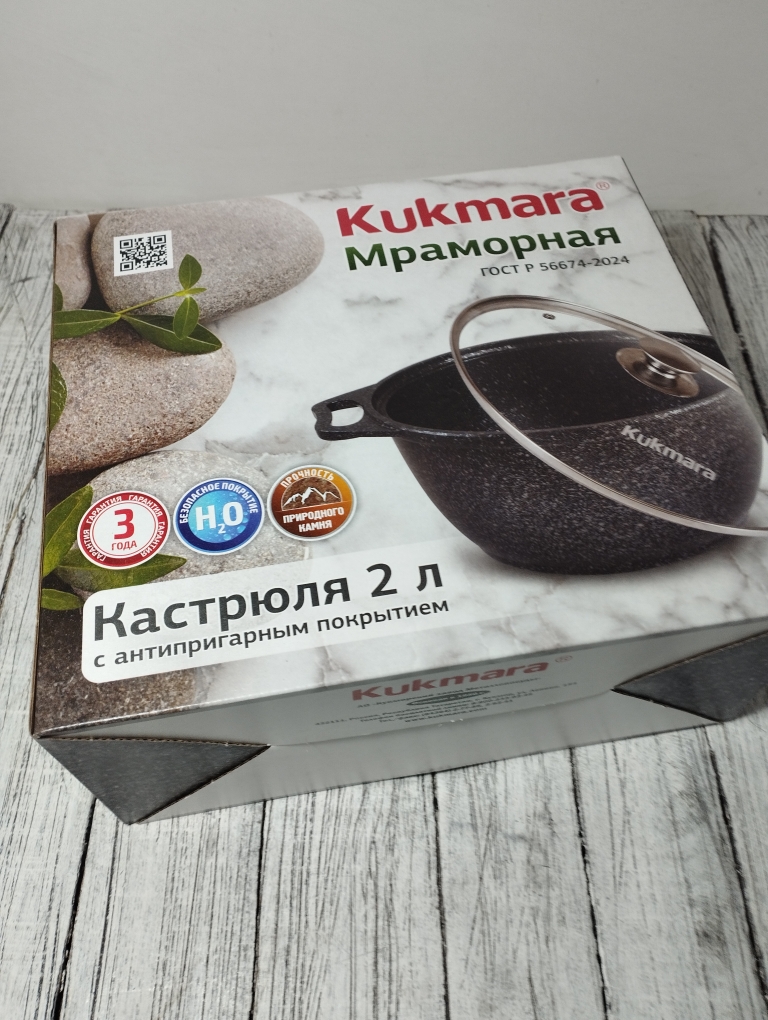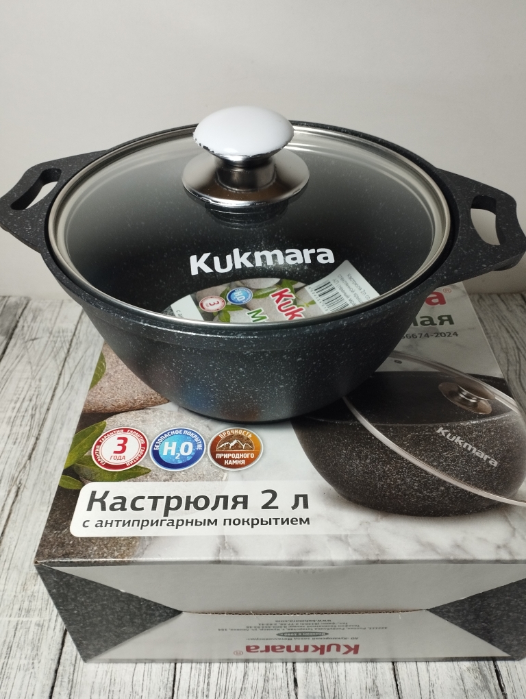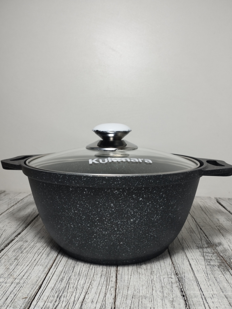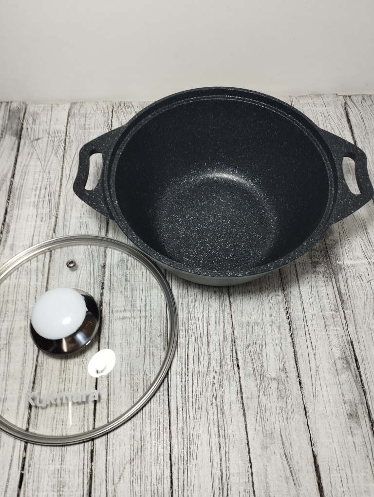 Кастрюля объемом 2 литра выполнен из высококачественного алюминиевого сплава с многослойным мраморным антипригарным покрытием что обеспечивает 16000 циклов приготовления. Утолщенное дно обеспечивает равномерное распределение тепла, что особенно важно при готовке блюд восточной кухни. Стеклянная крышка плотно закрывается, сохраняя ароматы внутри казана и позволяя контролировать процесс приготовления. Бренд "Кукмара" известен своей надежностью и долговечностью продукции, что делает данный казан отличным выбором для любителей вкусной домашней еды.