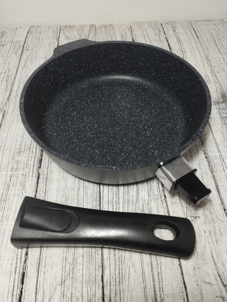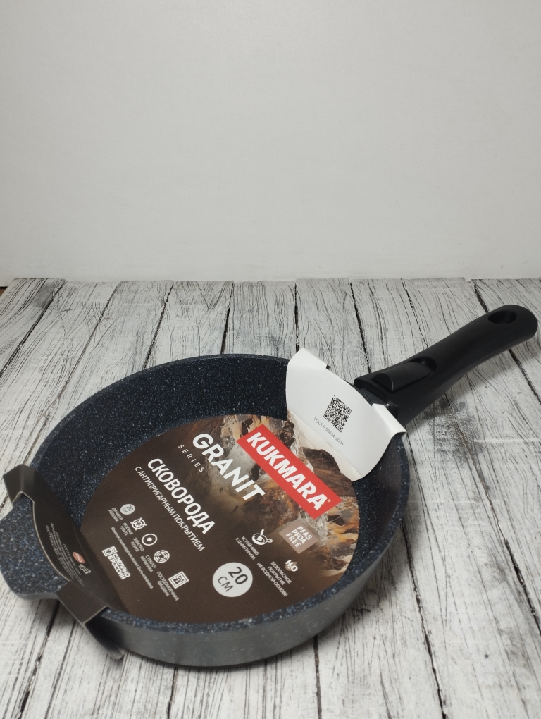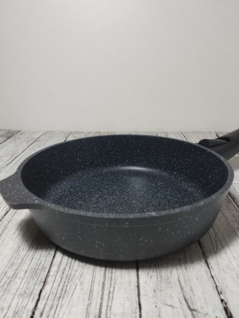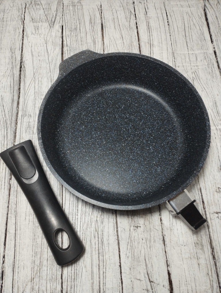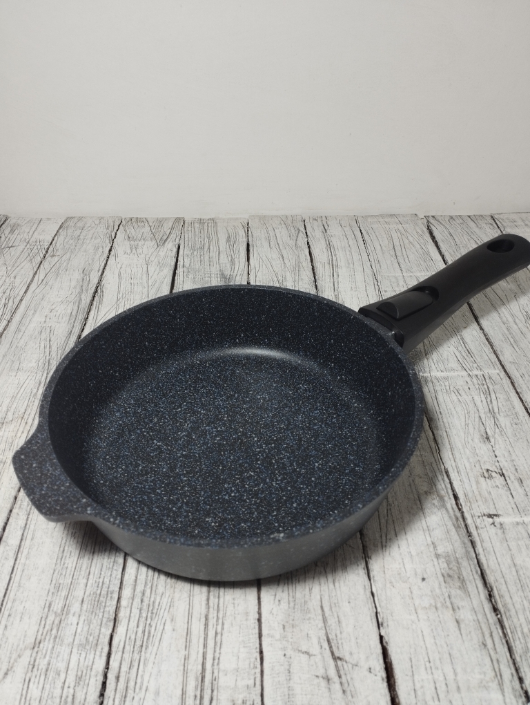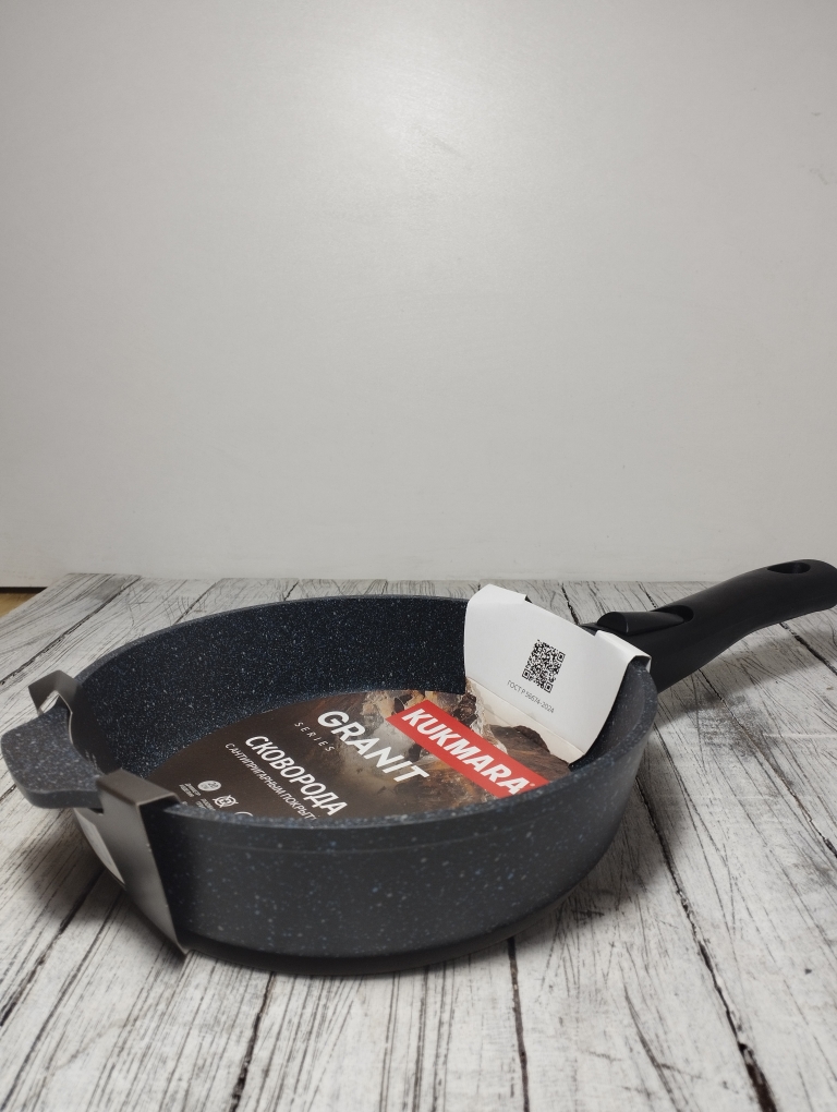 Литая алюминиевая сковорода, с надежным покрытием Granit Black, со съемной бакелитовой ручкой от бренда Кукмара. Преимущества сковороды Kukmara - одного из старейших производителей посуды в России - значительная толщина стенок и дна исключает деформацию корпуса, долговечность, идеальное распределение тепла по всей поверхности посуды, длительное сохранение тепла, экологически безопасная.