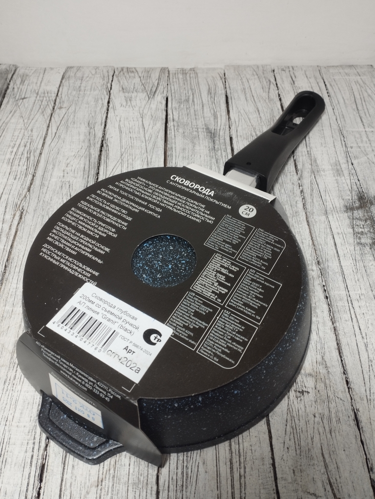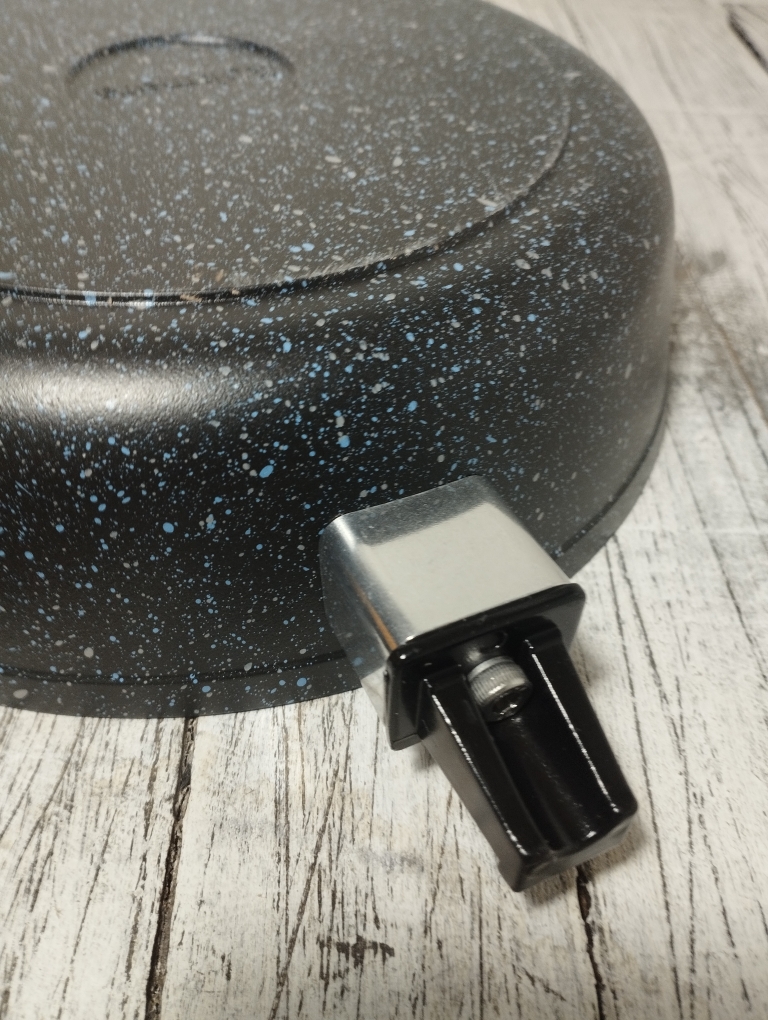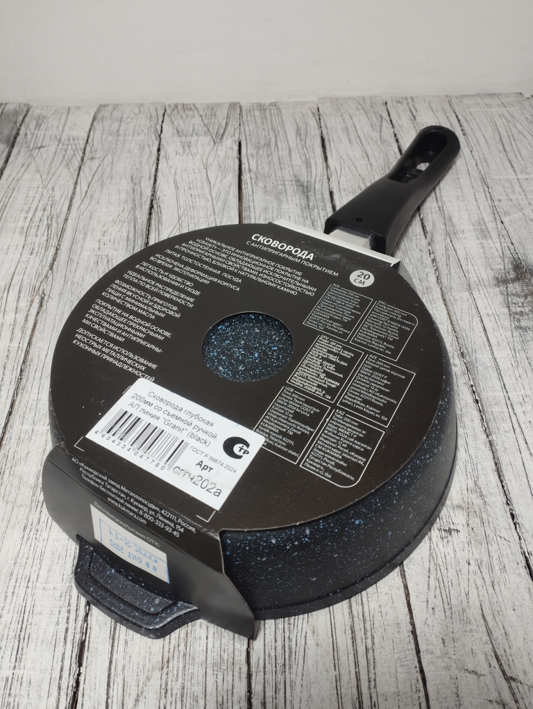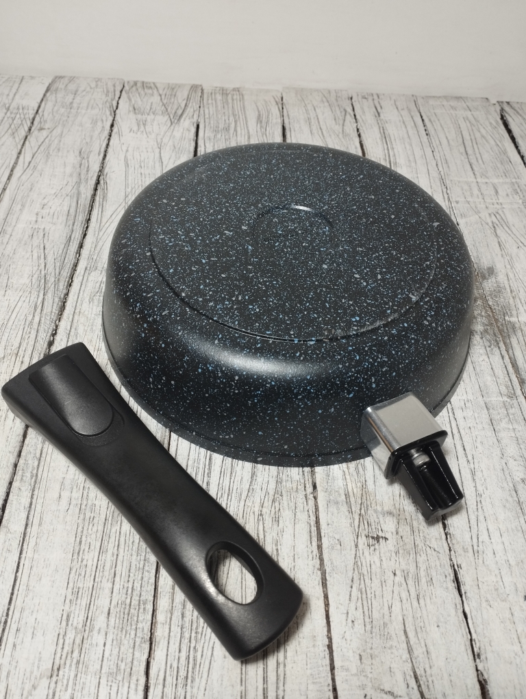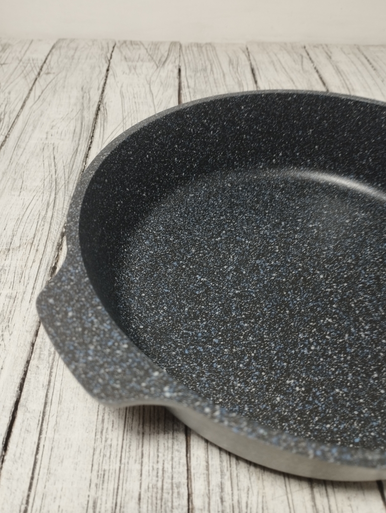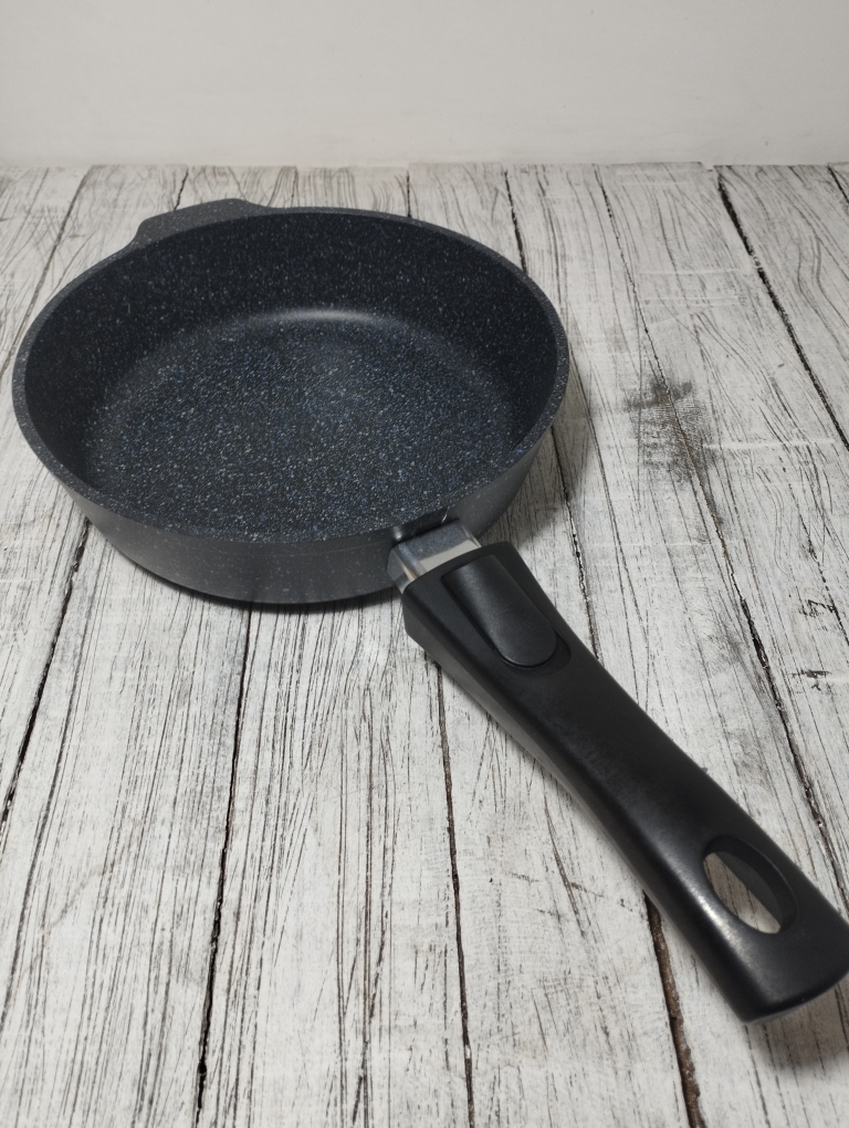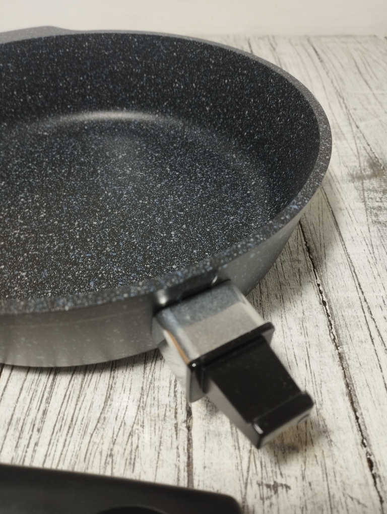 Литая алюминиевая сковорода, с надежным покрытием Granit Black, со съемной бакелитовой ручкой от бренда Кукмара. Преимущества сковороды Kukmara - одного из старейших производителей посуды в России - значительная толщина стенок и дна исключает деформацию корпуса, долговечность, идеальное распределение тепла по всей поверхности посуды, длительное сохранение тепла, экологически безопасная.
