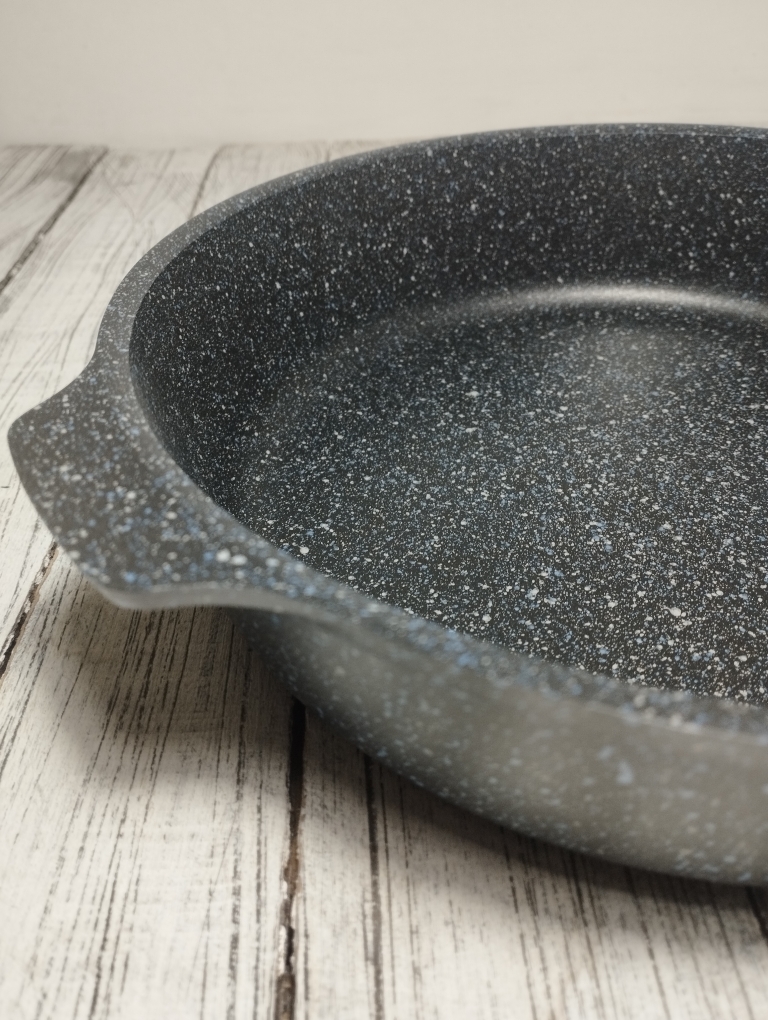 Литая алюминиевая сковорода, с надежным покрытием Granit Black, со съемной бакелитовой ручкой от бренда Кукмара. Преимущества сковороды Kukmara - одного из старейших производителей посуды в России - значительная толщина стенок и дна исключает деформацию корпуса, долговечность, идеальное распределение тепла по всей поверхности посуды, длительное сохранение тепла, экологически безопасная.